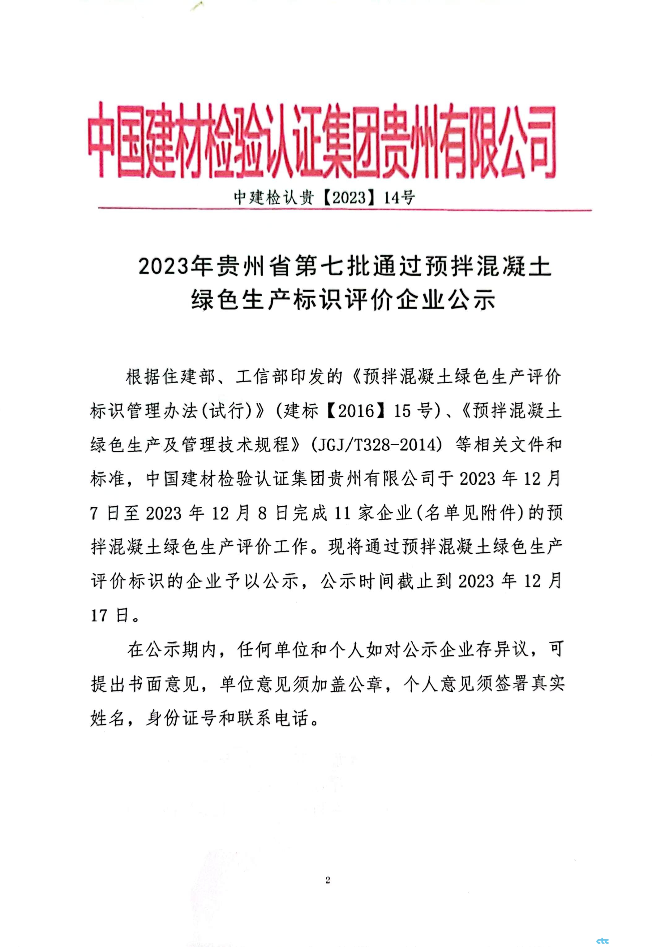 2023年貴州省第七批通過(guò)預(yù)拌混凝土綠色生產(chǎn)標(biāo)識(shí)評(píng)價(jià)企業(yè)公示